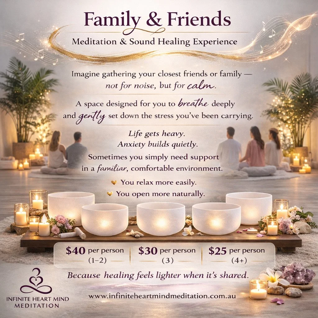 Many people arrive here not because something is wrong with them, but because their nervous system has been holding too much for too long. Infinite Heart Mind Meditation a calm, welcoming healing space where your body can finally exhale, your mind can soften, and your inner strength can naturally return. Through guided meditation and therapeutic sound healing, you’re invited to step out of stress and overwhelm, and gently reconnect with the deepest truth of who you are.